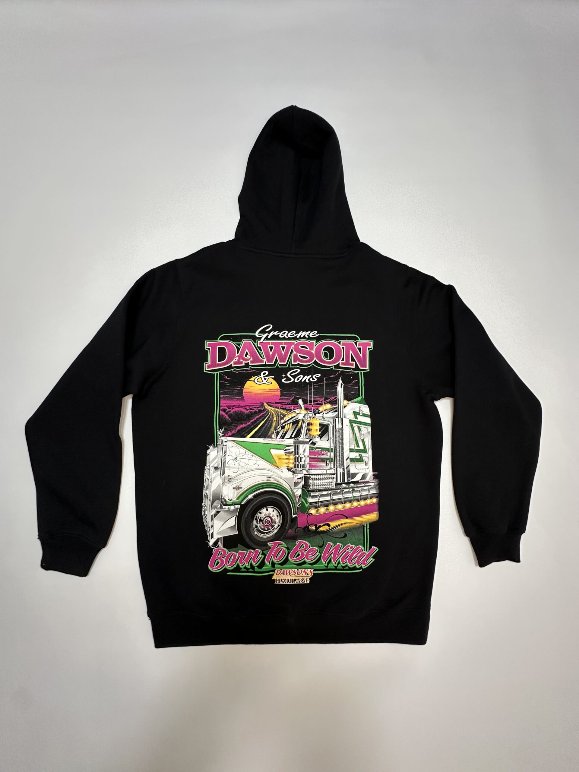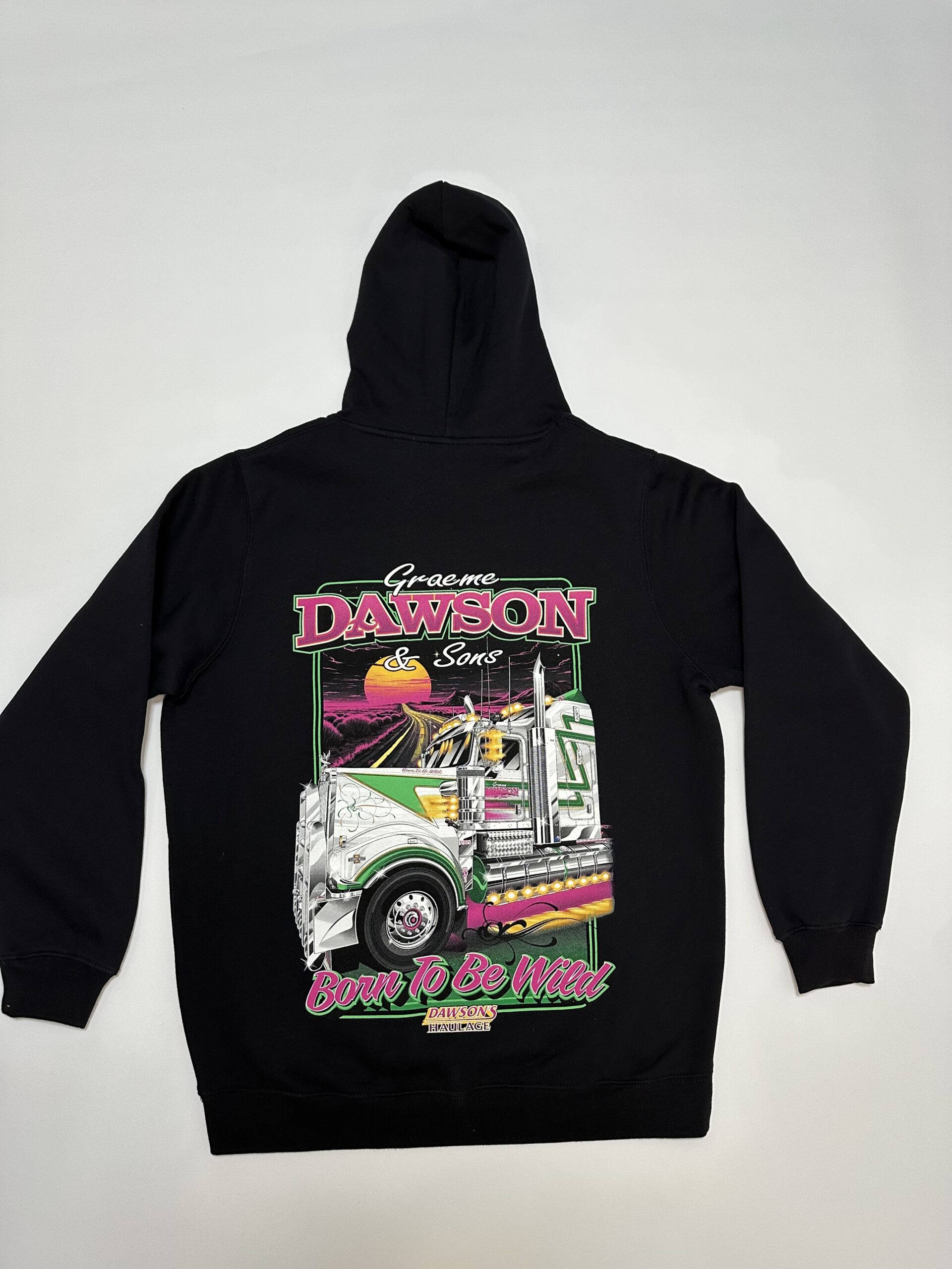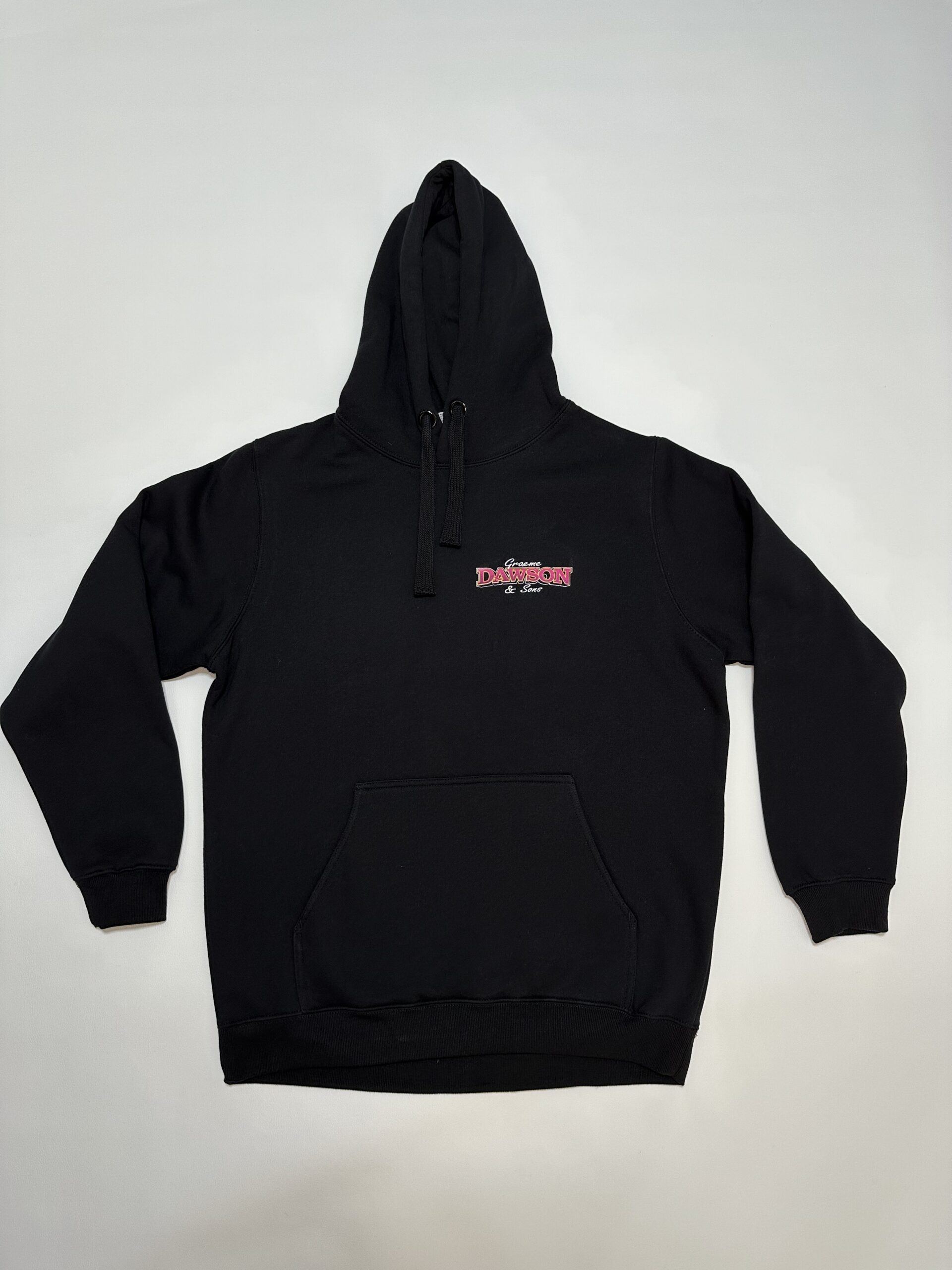 Sharp black hoodie with 'Graeme Dawson & Sons' logo screen printed on the right side of the chest.